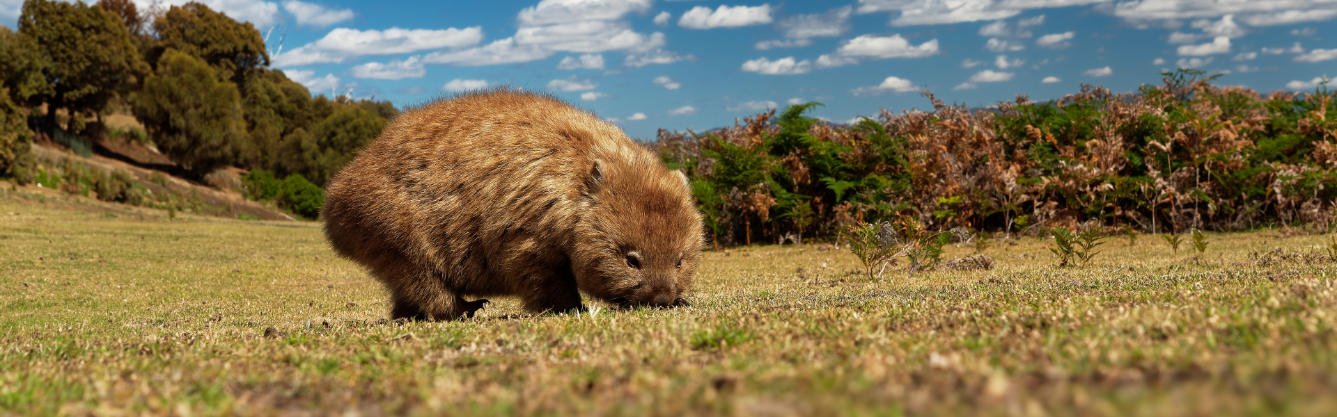 Wombats are primarily nocturnal creatures, but in Tassie, they can often be spotted out and about during daylight hours. During the day, they seek shelter in burrows, which can range from a simple hole in the ground to an intricate underground tunnel system. One wombat may regularly use multiple burrows (average 13) and even share burrows with their neighbours (though usually not at the same time!). Wombats are thick-skinned, particularly on the rump. This, and a broad plate of bone and muscle, offers them protection from predators when taking cover in a burrow or “bolthole”, sealing the entrance using their bottoms. While wombats may look lackadaisical, they can reach an incredible top speed of 40km per hour if needed. Home ranges can vary significantly in size but one study found that wombats roamed an average of 17 hectares with a core area of use typically around three hectares. A study of Victorian wombats also found that males moved approximately 833 metres every night, while females moved around 500 metres. Wombats can breed at any time of year. Joeys leave the pouch when they are around six months old and weigh approximately three kilograms, but they only leave their mother’s watchful eye at about 18 months.